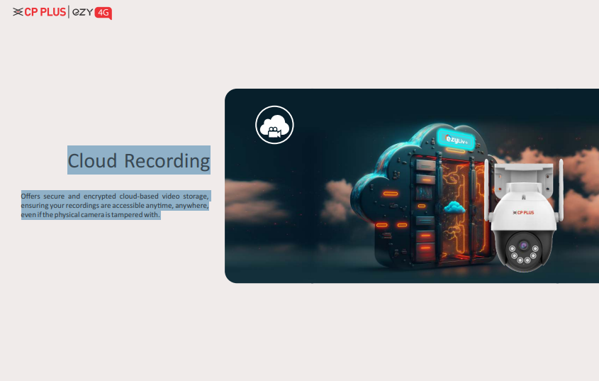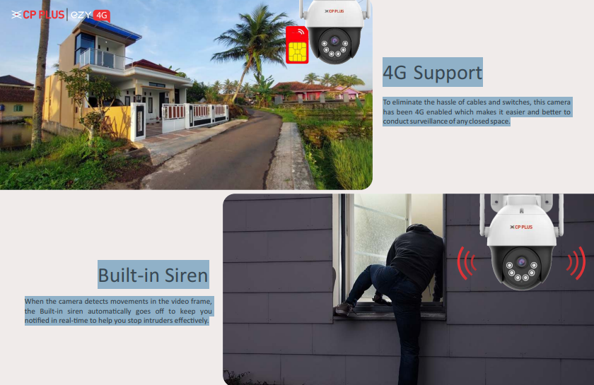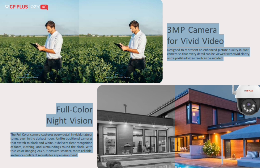 The CP Plus EZ-S35T is a 3MP outdoor 4G LTE security camera designed for surveillance in locations where Wi-Fi or broadband is not available. It connects through a 4G LTE SIM card and does not support Wi-Fi connectivity. The camera operates independently without requiring an NVR and supports local recording via microSD card up to 256GB as well as optional cloud storage.