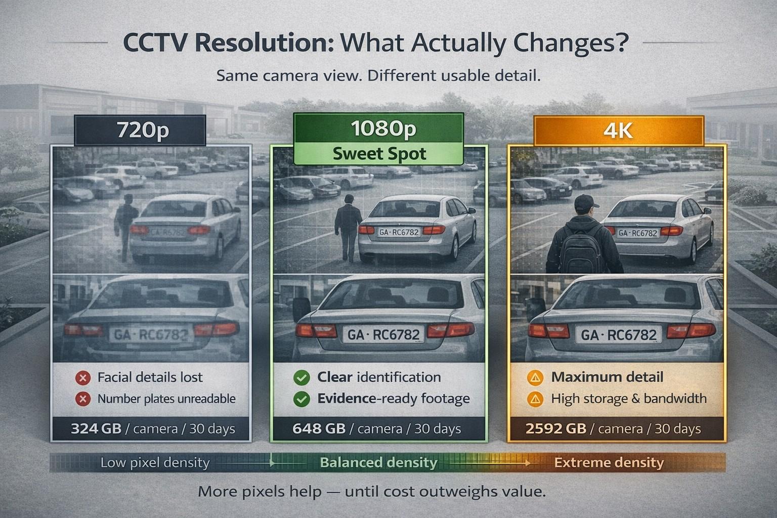 - 4K – Only needed for critical zones (cash counters, safes, entry gates) where you need to zoom and still see detail