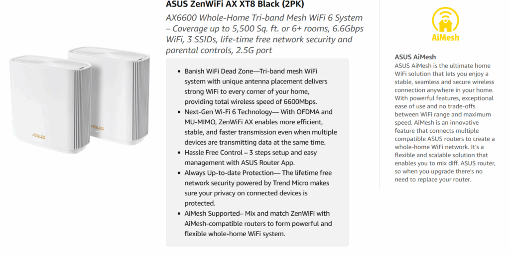 ASUS AX XT8 White 2 Pack – AX6600 Tri-Band WiFi 6 Mesh System, 5,500 Sq. Ft Coverage, 6.6 Gbps Speeds, 2.5G Port, AiMesh, Lifetime Security