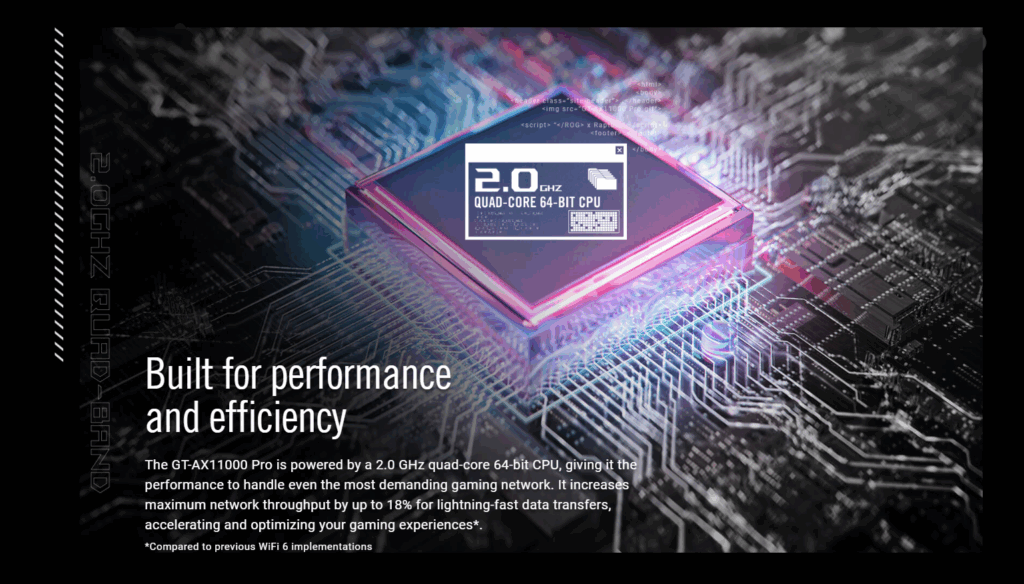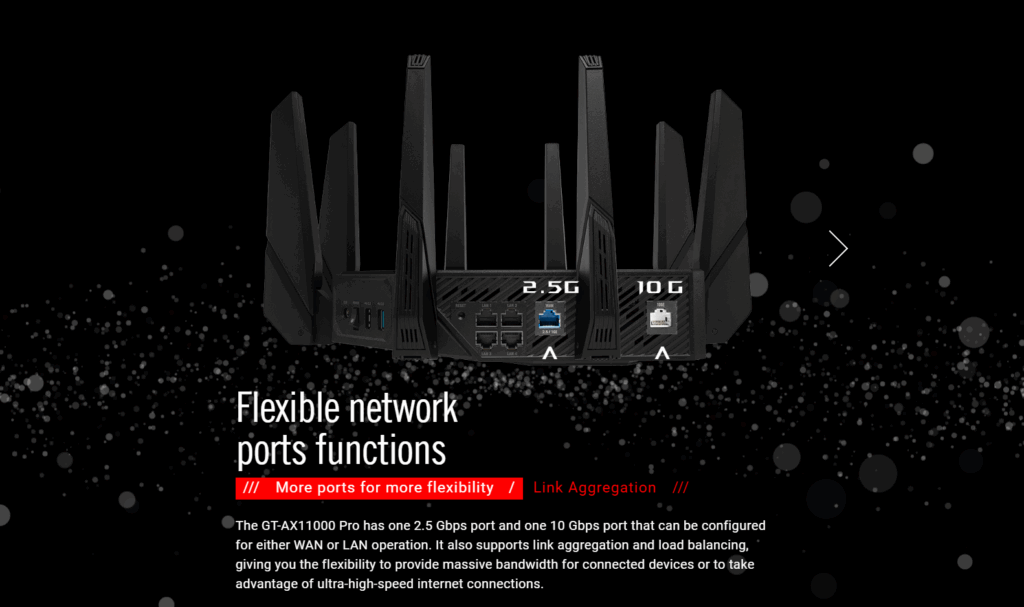Powered by a 2.0 GHz 64-bit quad-core processor coupled with 1GB DDR4 RAM and 256MB NAND flash memory, the ASUS GT-AX11000 PRO enables superior wireless signal processing and network management capabilities. The ASUS GT-AX11000-PRO router features flexible, multi-gigabit connectivity options, including one 2.5 Gbps WAN port and one ultra-fast 10 Gbps WAN/LAN port, which can be configured to meet different networking requirements, such as high-speed internet access or local device connection aggregation.