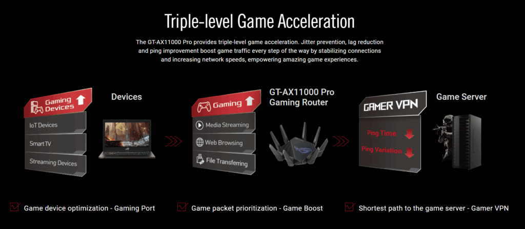 • Triple-Level Game Acceleration: Optimized traffic handling from device to game server for low latency and smooth gaming