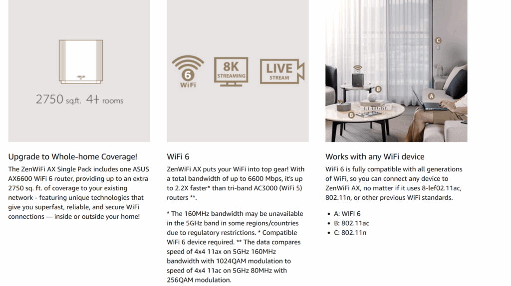 The ASUS ZenWiFi AX XT8 (White, 1-Pack) is a premium WiFi 6 router that delivers lightning-fast AX6600 Tri-Band speeds and wide coverage, making it perfect for large homes and modern smart living. ASUS ZenWiFi AX XT8 is combining 574 Mbps (2.4 GHz), 1201 Mbps (5 GHz-1), and 4804 Mbps (5 GHz-2), it ensures a total throughput of up to 6600 Mbps for 4K/8K streaming, gaming, and heavy multi-device usage.