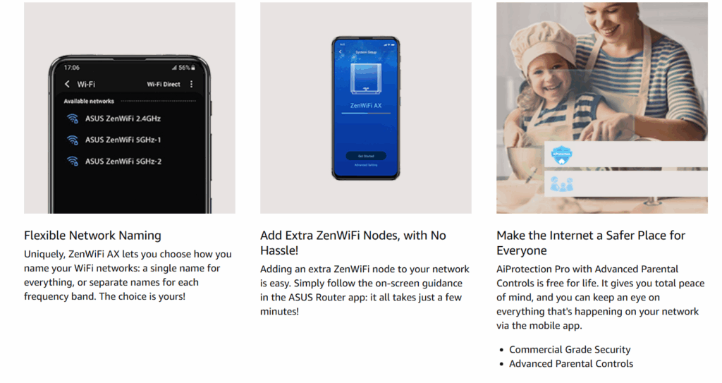 Advanced security is built-in with AiProtection Pro (Trend Micro), providing lifetime network protection, WPA3 encryption, and DNS-over-TLS for safe browsing. Families benefit from strong parental controls, while gamers and streamers can enjoy low-latency performance with Adaptive QoS and traffic prioritization.