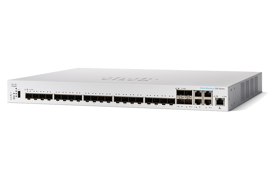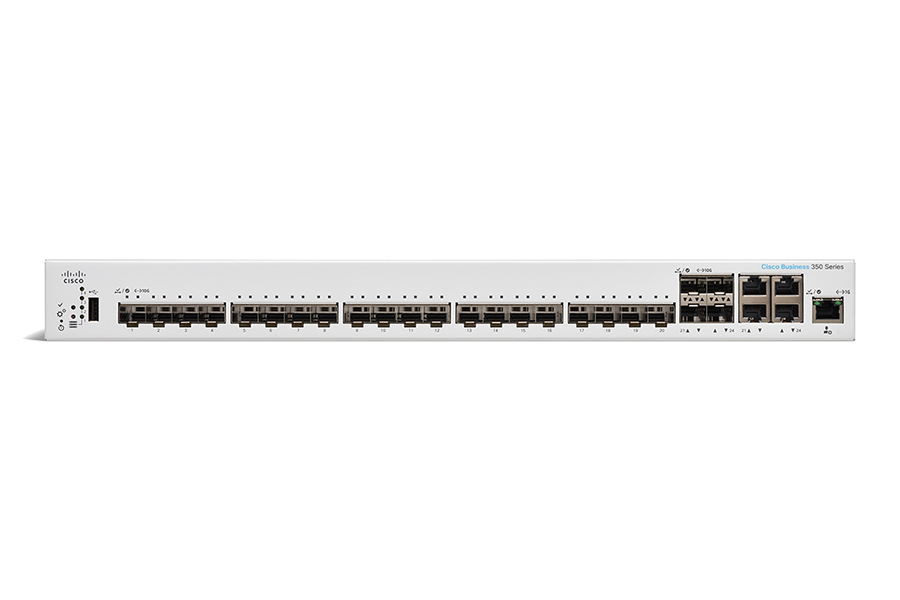 The Cisco Business CBS350-24XS managed switch offers advanced Layer 2 and Layer 3 capabilities, including VLAN support, static routing, and link aggregation. It features robust security through ACLs, port security, DHCP snooping, and 802.1X port-based access control to safeguard business networks. The Cisco Business CBS350-24XS switch includes an intuitive web interface and supports the Cisco Business Dashboard for centralised network management, making configuration and monitoring straightforward even for less experienced users.