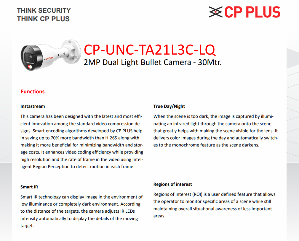 CP PLUS 2MP Dual Light Bullet Camera comes with Instastream smart compression significantly reduces bandwidth and storage usage without compromising video quality. Advanced features such as ROI, smart IR, human detection, and triple-stream support enhance monitoring efficiency and enable smarter search when paired with compatible CP PLUS NVRs.