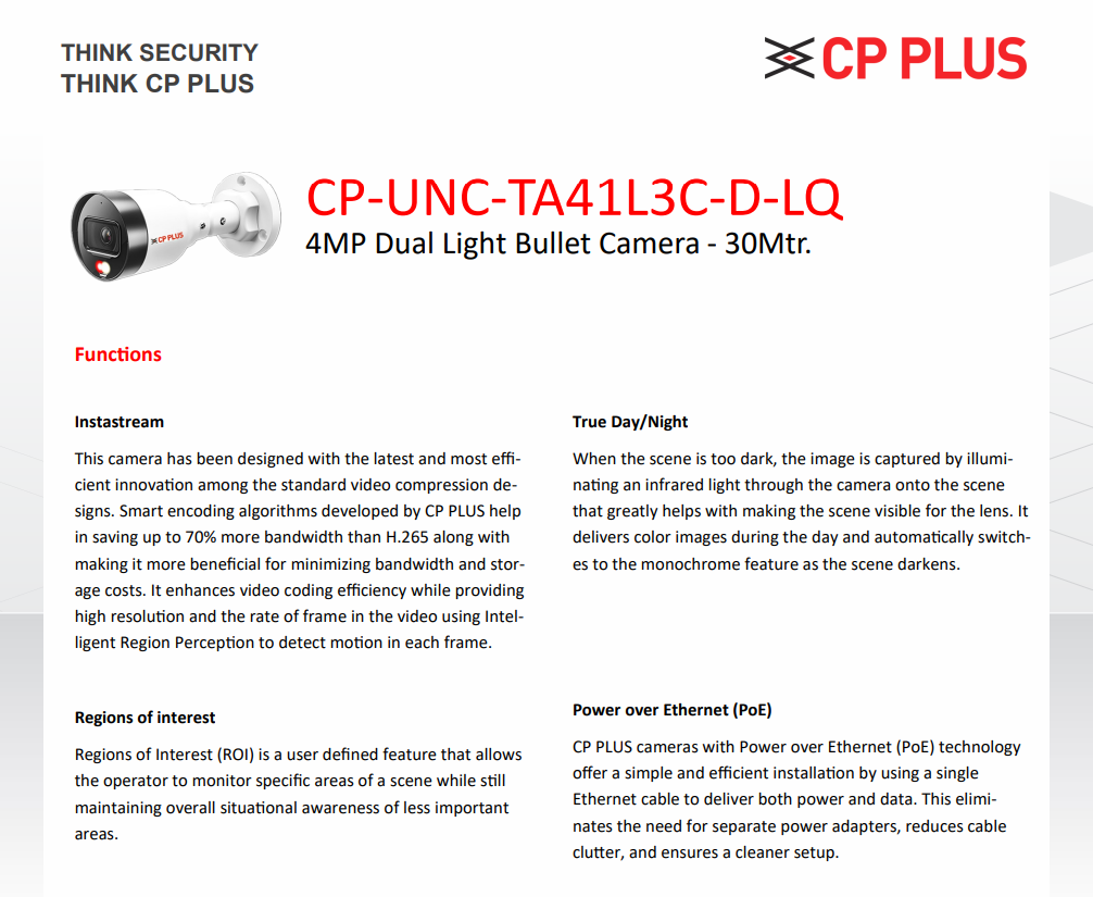 CP PLUS 4MP Dual Light Bullet IP Camera features Instastream H.265 compression, triple-stream support, and 3D noise reduction, this camera minimizes bandwidth and storage costs while maintaining high-quality footage. ROI and privacy mask features allow precise monitoring of critical areas.