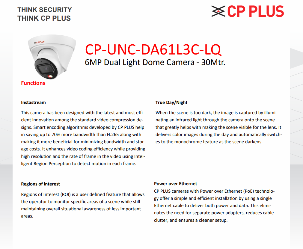 CP PLUS 6MP Dual Light IP Dome Camera is built with Trusted Core Technology, this 6MP dome camera combines advanced cybersecurity, intelligent video processing, and adaptive lighting for modern surveillance needs. The dual light system ensures excellent visibility even in complete darkness, while Instastream technology significantly reduces bandwidth and storage costs without compromising image quality.
