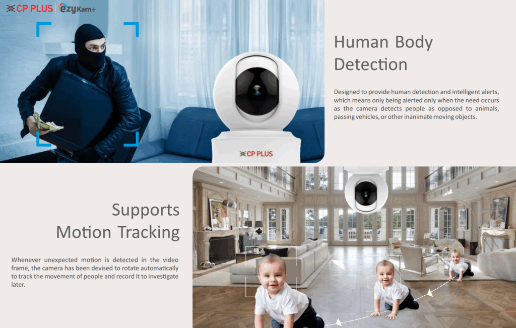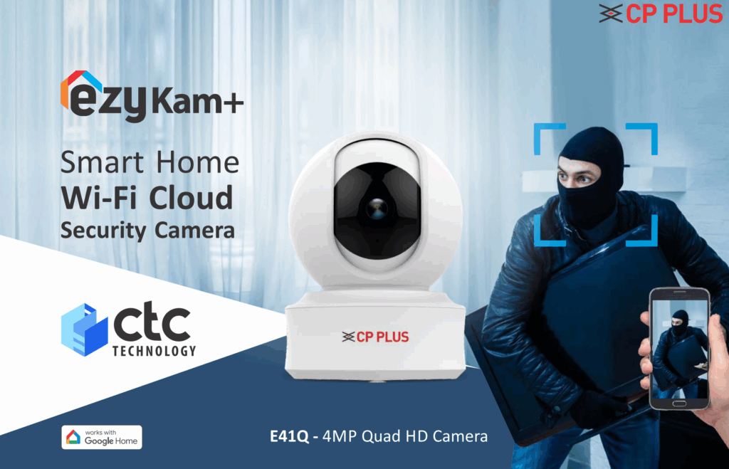 CP Plus CP-E41Q 4MP indoor PT camera offers AI human detection, auto motion tracking, a built‑in siren, two‑way talk, and Ethernet connectivity. With 2560 x 1440 resolution, 15m IR night vision, and Google Home compatibility, it provides intelligent, high‑definition home security.