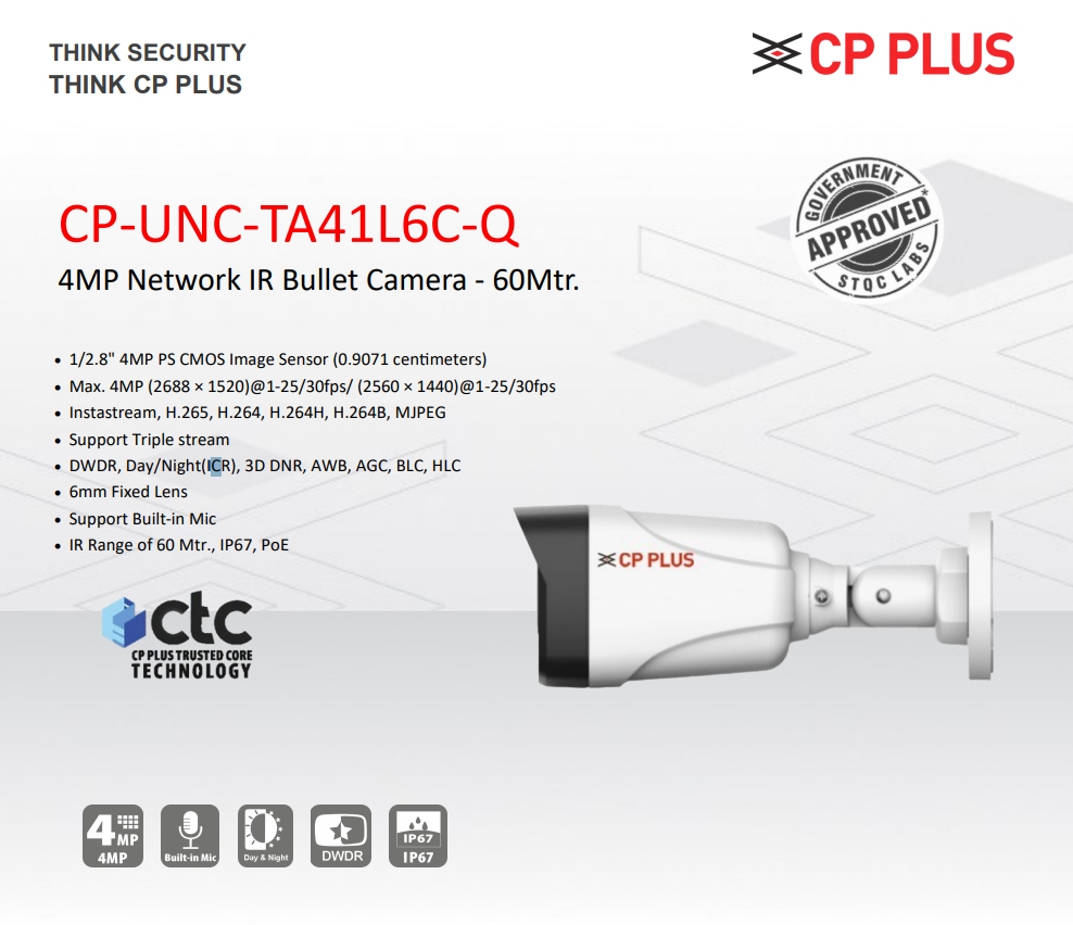 The CP PLUS CP-UNC-TA41L6C-Q comes with a 6 mm fixed lens for precise focus, IR LEDs offering a night vision range of up to 60 meters, and a built-in microphone for synchronised audio monitoring. CP PLUS CP-UNC-TA41L6C-Q Power over Ethernet (PoE) support simplifies installation by combining data and power through a single cable.