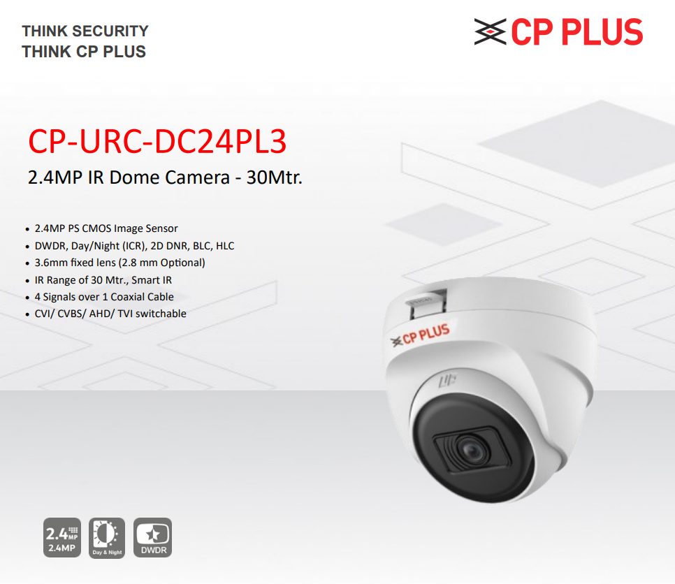 The CP PLUS CP-URC-DC24PL3 Â is a powerful 2.4MP IR Dome Camera engineered to deliver superior image quality with advanced features for effective surveillance. Equipped with a 2.4MP PS CMOS image sensor, this camera captures crisp 1080p resolution video with excellent clarity. CP PLUS CP-URC-DC24PL3Â features a 3.6mm fixed lens with an optional 2.8mm lens, providing versatile viewing angles and detection ranges up to 55 meters. CP PLUS CP-URC-DC24PL3 camera utilizes innovative UNI technology, ensuring compatibility with all major analog HD video formats including CVBS, TVI, AHD, and HDCVI, making installation and upgrades seamless and hassle-free.
