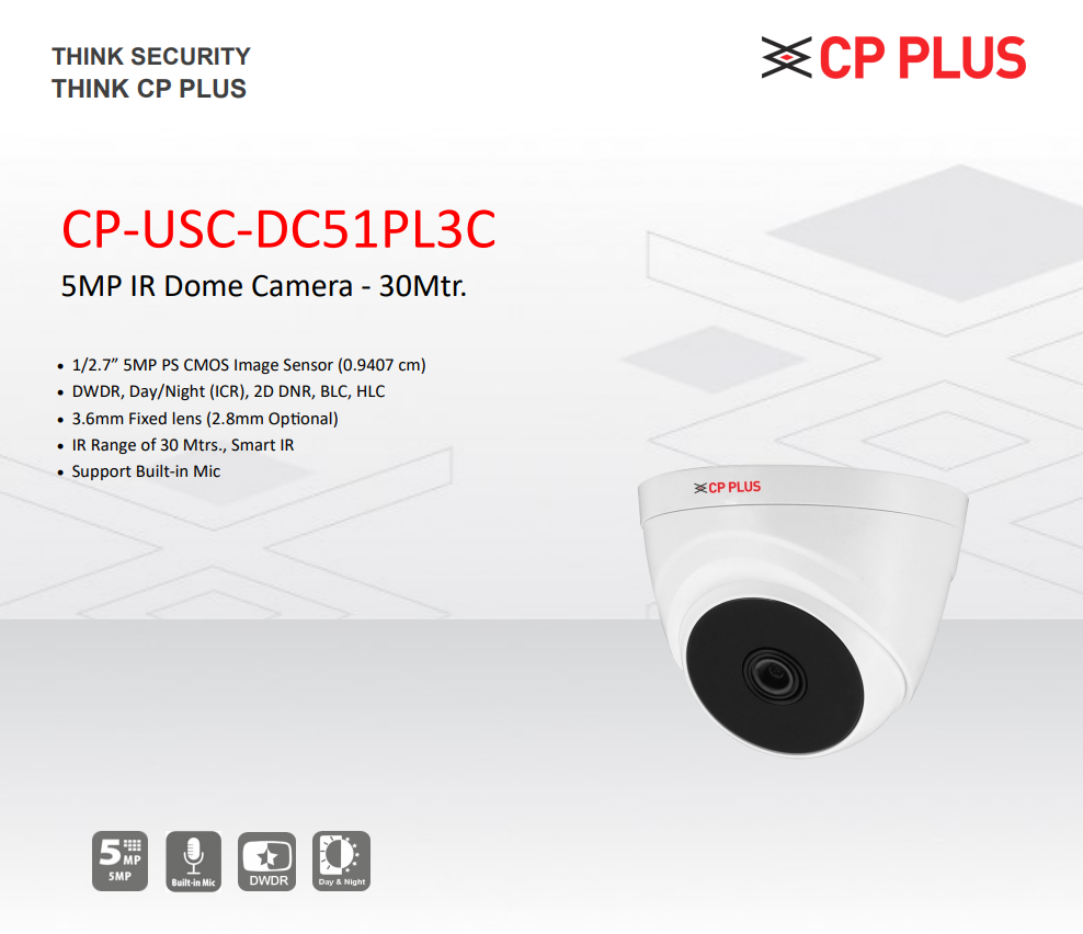 The CP PLUS CP-USC-DC51PL3C is a high-performance 5MP IR Dome Camera engineered for superior security surveillance. This camera is equipped with a 12.7mm 5MP PS CMOS Image Sensor delivering stunning 2880×1620 HD resolution for clear and detailed images. Designed with advanced Day/Night ICR and DWDR technologies, it ensures optimal image quality even in challenging lighting conditions. The CP-USC-DC51PL3C comes with a fixed 3.6mm lens (an optional 2.8mm is available), providing an 80° field of view, ideal for wide area monitoring.