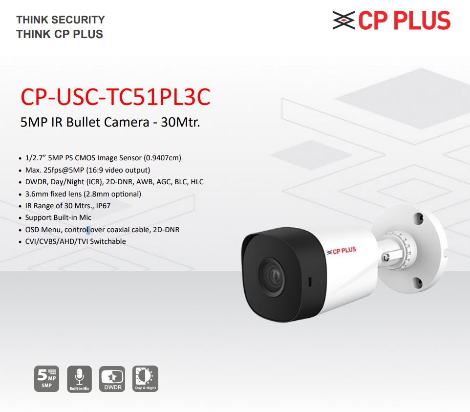The CP PLUS CP-USC-TC51PL3C is a cutting-edge 5MP IR Bullet Camera designed to deliver superior analog HD surveillance that is both budget-friendly and technologically advanced. This camera, featuring a 1/2.7″ 5MP PS CMOS image sensor, supports up to 25fps at 5MP resolution (16:9 video output) to provide crisp and clear images for effective monitoring.  incorporates advanced imaging technologies such as DWDR, Day/Night (ICR), 2D-DNR, AWB, AGC, BLC, and HLC that ensure optimal visibility under varying light conditions. Equipped with a 3.6mm fixed lens (optionally 2.8mm), it delivers wide-angle coverage with impressive DORI distances for detection, observation, recognition, and identification.