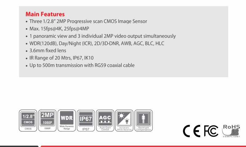Video Output: 1-channel panoramic HDCVI, 3-channel 2MP HDCVI