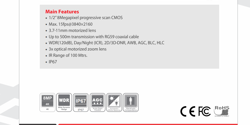 • 12 Megapixel progressive scan CMOS sensor providing 8MP resolution (3840×2160)