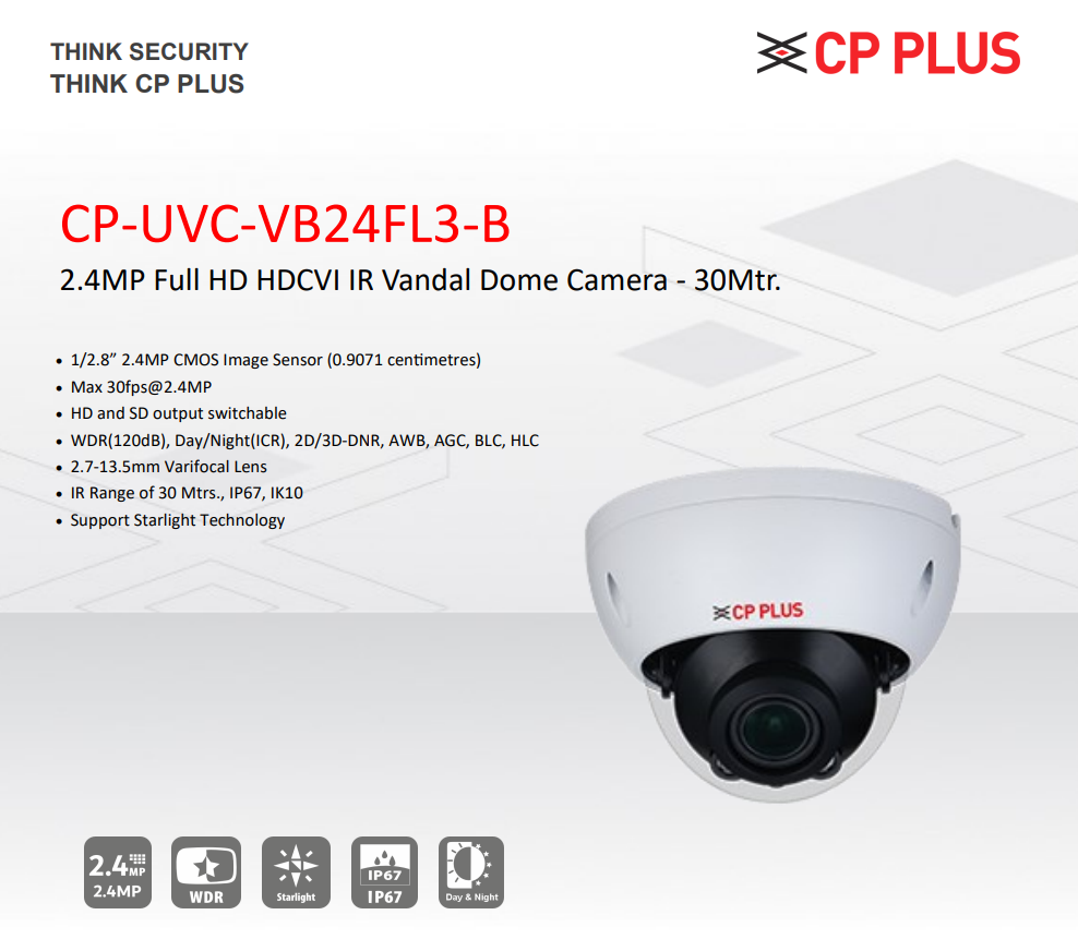 The CP PLUS CP-UVC-VB24FL3-B is an advanced 2.4MP Full HD HDCVI IR Vandal Dome Camera designed to deliver superior surveillance performance for both residential and commercial installations. This powerful dome camera features a 2.4MP CMOS image sensor that supports high-definition video recording at up to 30 frames per second, ensuring clear and detailed footage. The model CP-UVC-VB24FL3-B includes a versatile 2.7-13.5mm varifocal lens, allowing precise adjustment of the viewing angle to capture critical areas effectively.