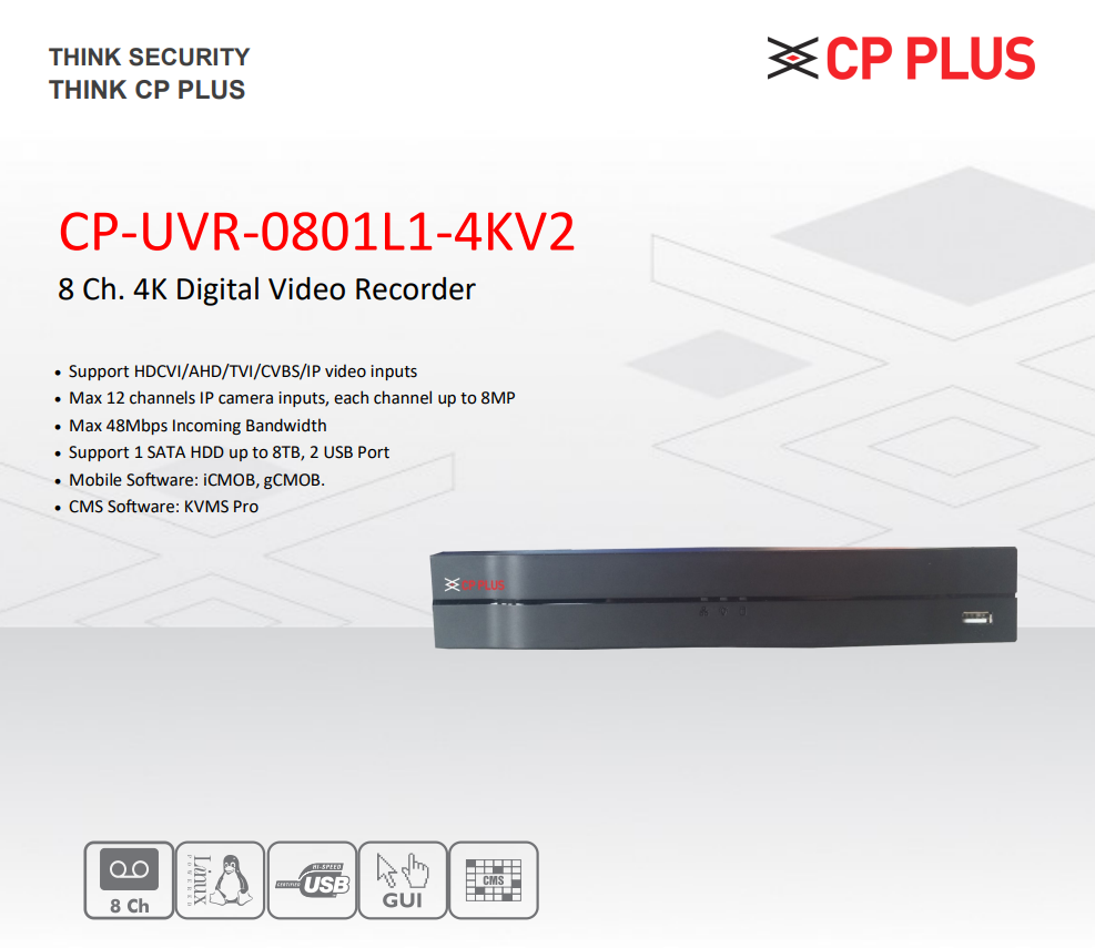 CP PLUS CP-UVR-0801L1-4KV2 CP PLUS DVR allows users to manage and monitor systems remotely via the intuitive CMS software KVMS Pro or directly through mobile applications like gCMOB and iCMOB. The embedded Linux-based processor enhances reliability while enabling quick response times. CP PLUS CP-UVR-0801L1-4KV2 DVR supports one SATA HDD (up to 8TB) for extended storage capacity and integrates both USB 2.0 and 3.0 interfaces for convenient data backup. Featuring 4K HDMI output, advanced motion detection, and remote video playback, this device ensures total surveillance coverage.