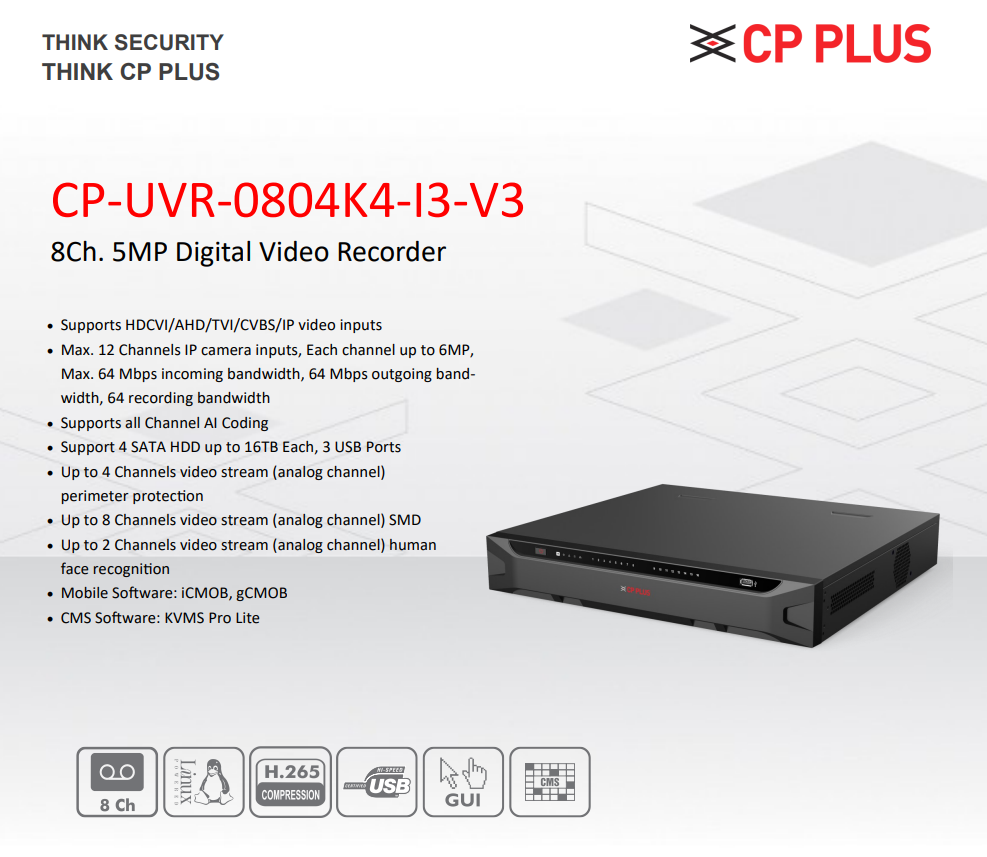 The advanced CP PLUS CP-UVR-0804K4-I3-V3, an 8-channel 5MP Digital Video Recorder, engineered to deliver secure, high-definition video surveillance for modern environments. This model is integrated with powerful 4K and H.265 encoding technologies to bring out outstanding image clarity while optimising storage and bandwidth. With a maximum input capacity of 12 IP cameras (up to 6MP per channel) and 64 Mbps incoming/outgoing/recording bandwidth, this robust DVR is ideal for enterprises, institutions, and citywide safety projects. The CP-UVR-0804K4-I3-V3 boasts AI-enabled all-channel coding, analog channel perimeter protection, smart motion detection, and advanced human face recognition for enhanced security automation.