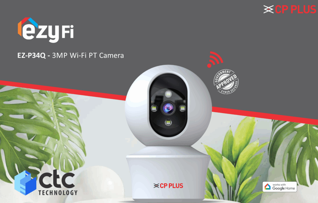 CP Plus EZ-P34Q 3MP indoor PT camera offers full‑color night vision (15‑20m) plus IR night vision (20‑30m), a built‑in siren, 342° pan / 60° tilt, and two‑way audio. With 3MP clarity, H.265 compression, and Google Home support, it delivers smart, reliable monitoring.