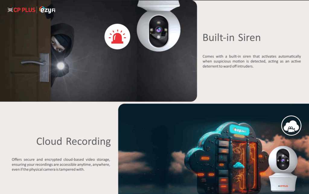 CP Plus EZ-P34Q has a standout capability is its dual‑mode night vision: four white LEDs produce full‑color video in low‑light conditions up to 15‑20 meters, while four infrared LEDs extend visibility to 20‑30 meters in total darkness. For proactive protection, the camera includes a built‑in siren that can be triggered manually via the app, along with motion detection that sends instant push notifications to your phone.