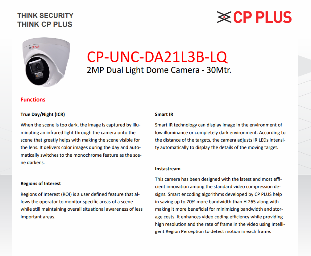 CP PLUS CP-UNC-DA21L3B-LQ is a 2MP IP dome camera with dual-light illumination, built-in microphone and speaker, PoE support, and fixed 3.6 mm lens for indoor or outdoor surveillance use.