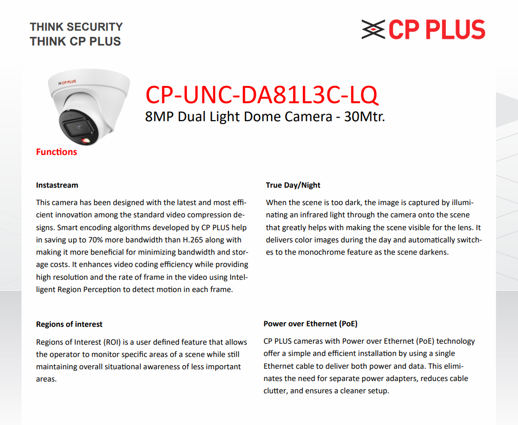 The CP PLUS CP-UNC-DA81L3C-LQ is an 8-megapixel IP dome surveillance camera designed for indoor and outdoor monitoring where high-resolution video, dual-light night visibility, and PoE installation are required.