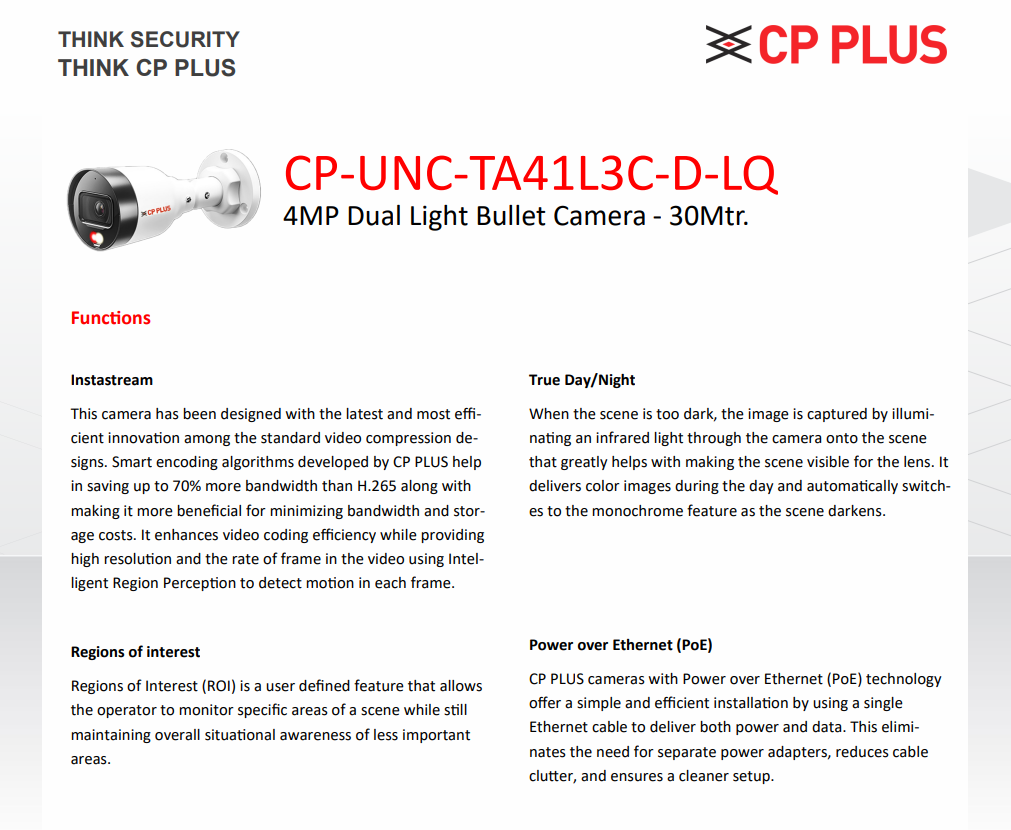 The CP PLUS CP-UNC-TA41L3C-D-LQ is a fixed-lens 4MP dual light bullet camera designed for network-based video surveillance in indoor and outdoor environments. It uses a 1/2.9-inch 4MP PS CMOS image sensor to deliver a maximum resolution of up to 2688 × 1520 at 25/30 frames per second, supporting both PAL and NTSC video formats.