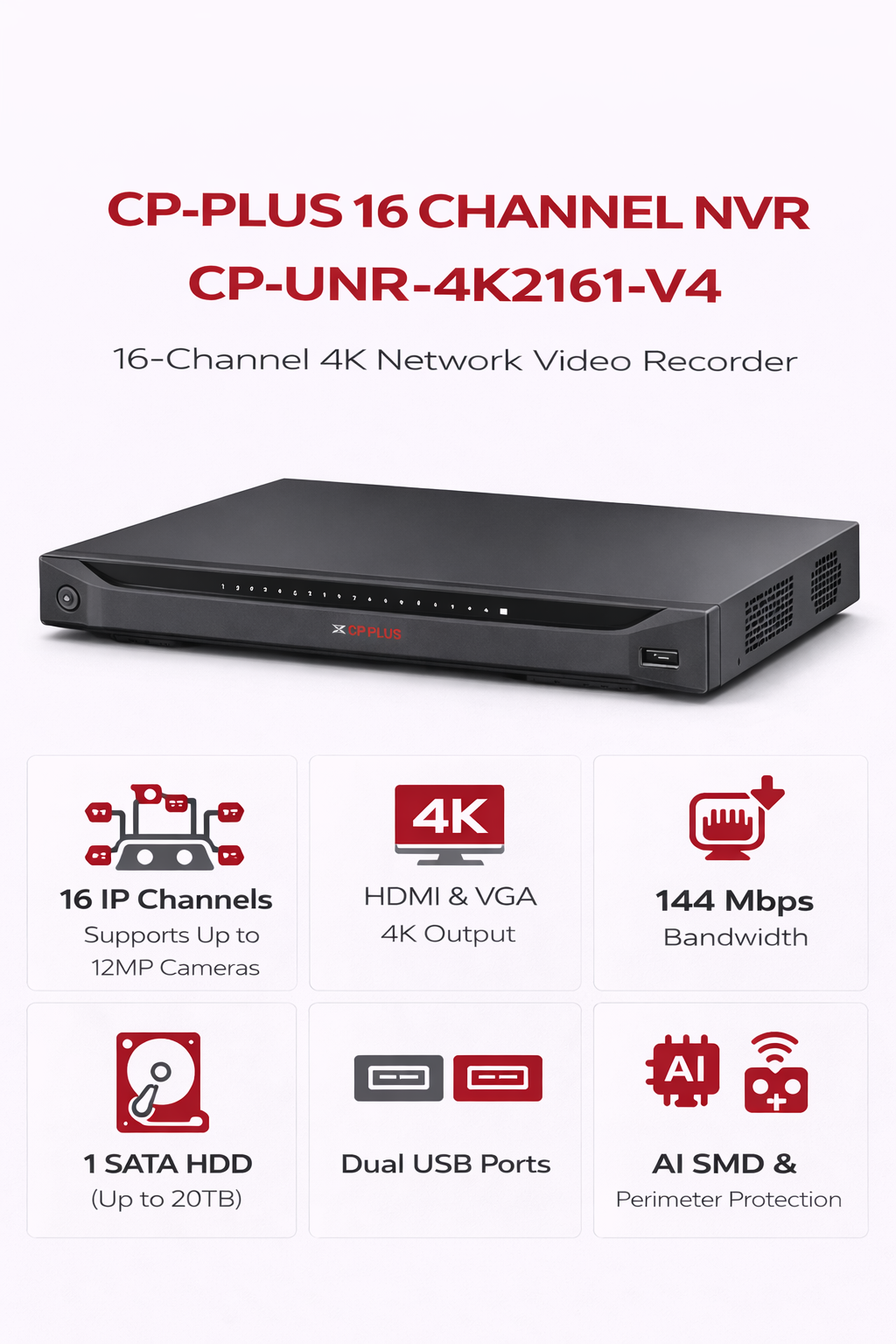 The CP PLUS CP-UNR-4K2161-V4 is a 16-channel Network Video Recorder designed for structured surveillance systems requiring high-resolution recording and intelligent detection. It supports IP cameras up to 12MP and delivers 4K HDMI output at 3840 × 2160 along with Full HD VGA output, enabling clear live monitoring and playback with multi-screen display modes of up to 16 channels.