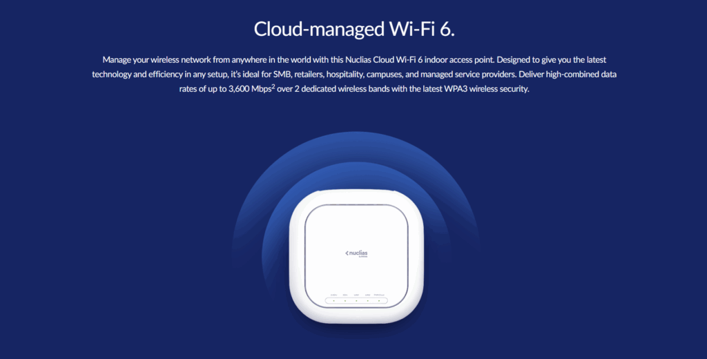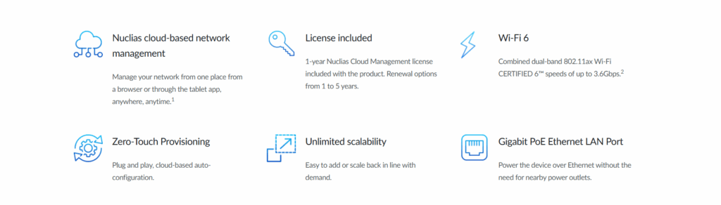 • Includes a 1-year Nuclias Cloud Management license with unlimited scalability