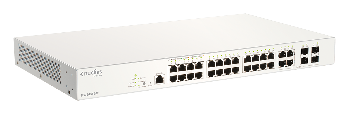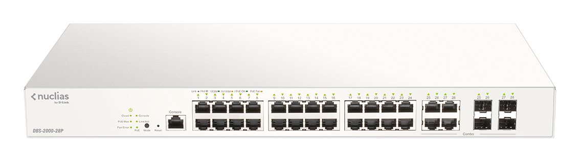 D-Link DBS-2000-28P—a 28-port Gigabit switch with 24 PoE+ ports and 193W power budget, ideal for powering devices like cameras and access points. Enjoy secure, centralized control with D-Link Nuclias Cloud, enabling zero-touch deployment and real-time management from anywhere. The DBS-2000-28P offers advanced Layer 2 security, robust VLAN settings, and remote monitoring for enterprise scalability and reliability.