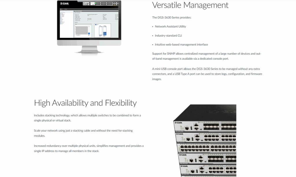 • Comprehensive Security: Multi-layer ACLs, 802.1X authentication, and D-Link Safeguard Engine protection