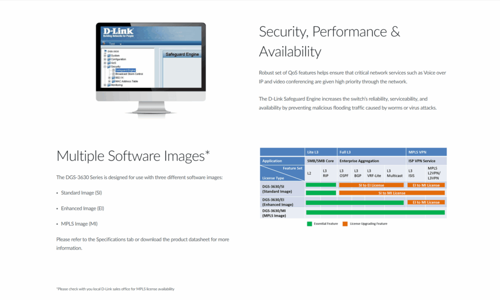 Built with enterprise-grade reliability, the DGS-3630-28SC includes 6kV surge protection on all Ethernet access ports, redundant power supply support, and an impressive MTBF of 280,612 hours. The switch supports multiple software images (Standard, Enhanced, and MPLS) allowing organizations to deploy only required features for cost-effective network management.