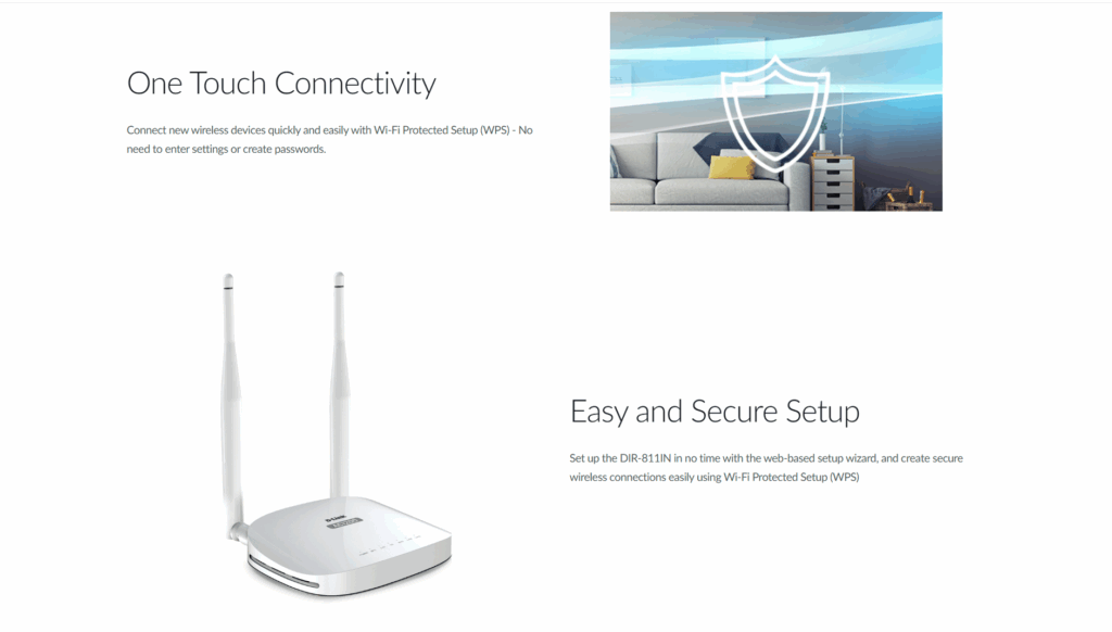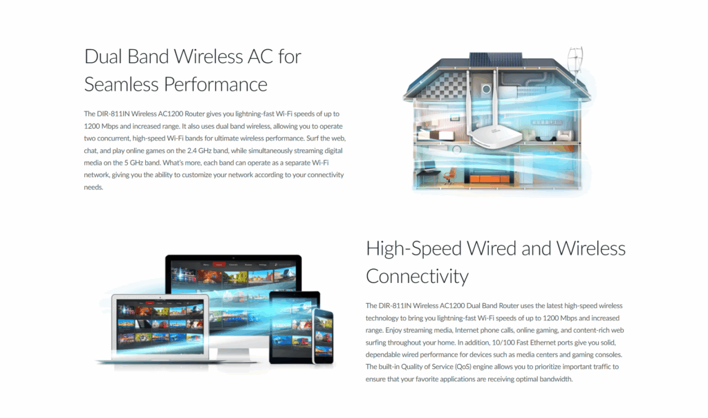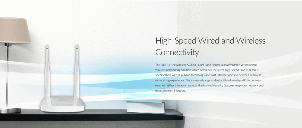 D-Link DIR-811IN AC1200 Wireless Router features dual band Wi-Fi with speeds up to 1200 Mbps, providing high-performance connectivity and enhanced coverage with its high-gain antennas. Secure your home network effortlessly with WPA2 encryption and easy WPS setup. Ideal for streaming, gaming, and IPTV services.