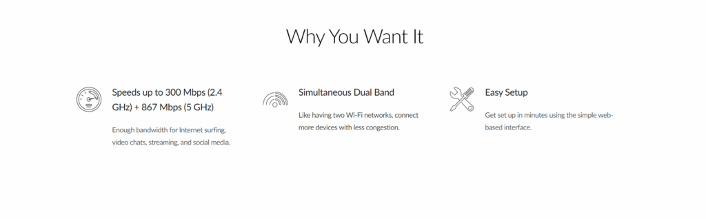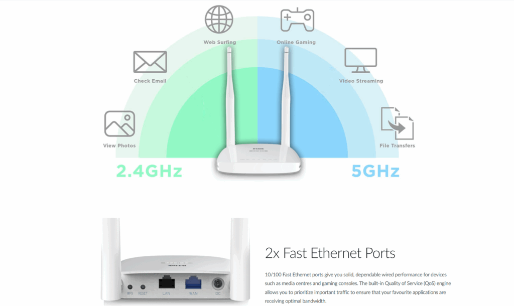 • Dual band Wi-Fi with combined speeds up to 1200 Mbps (2.4 GHz at 300 Mbps + 5 GHz at 867 Mbps)