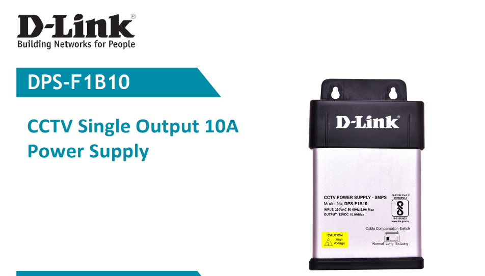 The D-Link DPS-F1B10 is a robust CCTV Single Output 10A Power Supply designed to meet the demanding needs of security camera installations. This model DPS-F1B10 power supply features a stabilized 12V DC output with a current rating of 10A, delivering a reliable 110W of power. The input voltage ranges from 180 to 264VAC, accommodating wide power source variations. With a metal case construction, this power supply is built for durability and efficient thermal management.