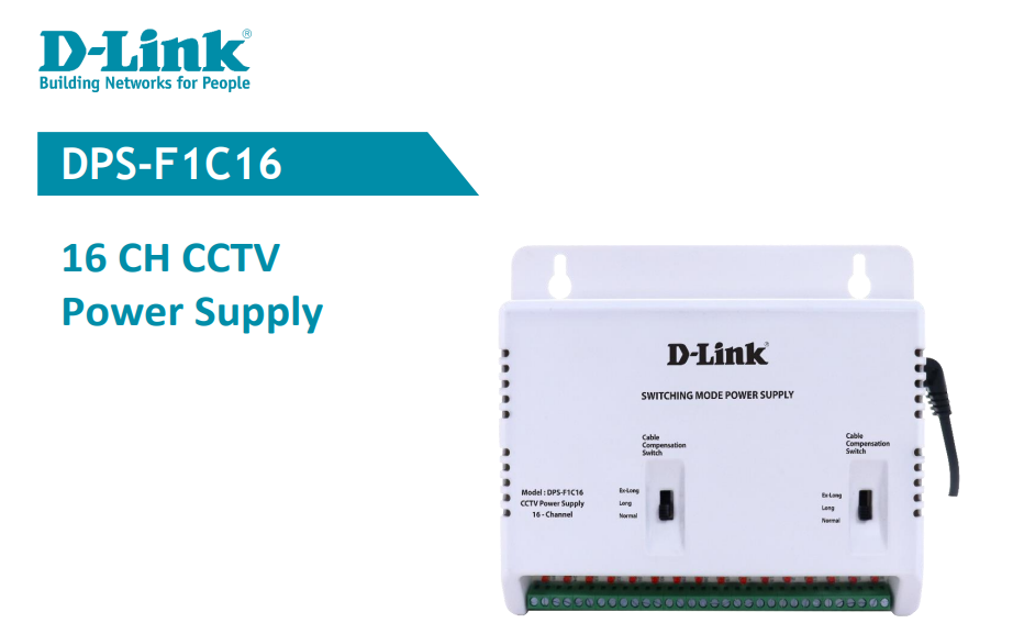 The D-Link DPS-F1C16 is a highly efficient and robust 16-channel CCTV power supply designed for stable and reliable security system performance. Featuring a wide input voltage range of 100VAC to 240VAC and operating frequency between 50Hz to 60Hz, this power supply ensures consistent 12V DC output with a maximum current of 1 ampere per channel. The D-Link DPS-F1C16 incorporates a high-quality, integrated SMPS switcher IC design that guarantees surge protection up to 3.5 kV while maintaining low ripple voltage (80 mV) and minimal interference for sensitive CCTV equipment.