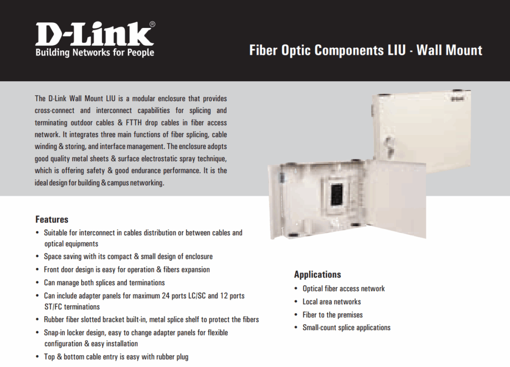 The D-Link Wall Mount LIU is a modular enclosure that provides cross-connect and interconnect capabilities for splicing and terminating outdoor cables & FTTH drop cables in fiber access