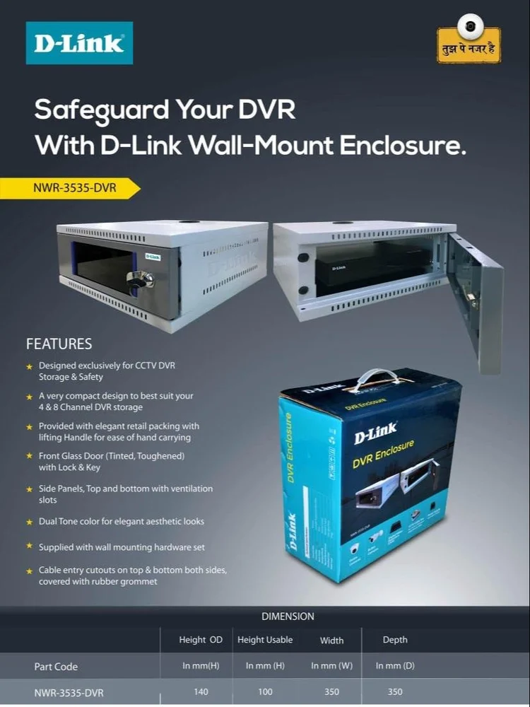 The D-Link NWR-3535-DVR-B is a durable and compact wall mount DVR enclosure designed for 4-8 channel CCTV DVRs. Built with 0.65mm thick CRCA steel and featuring a lockable toughened glass door, it offers excellent security and ventilation with cable entry cutouts for tidy wiring. Its powder-coated grey finish and sturdy design make it perfect for safe wall mounting of vital DVR equipment.