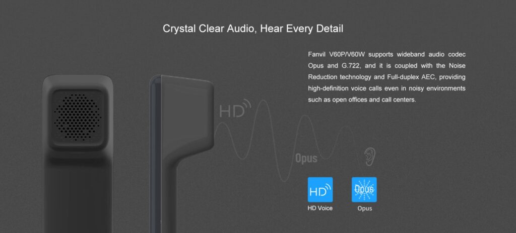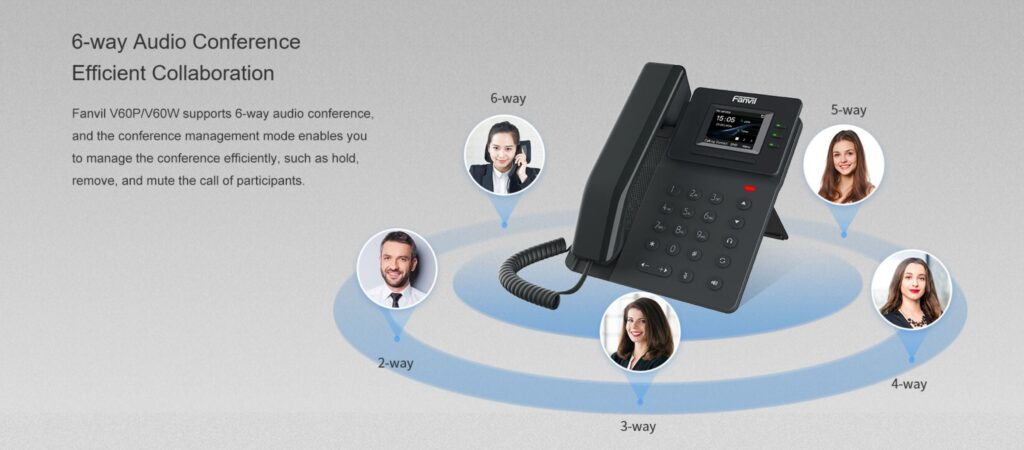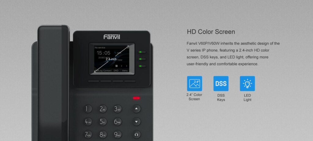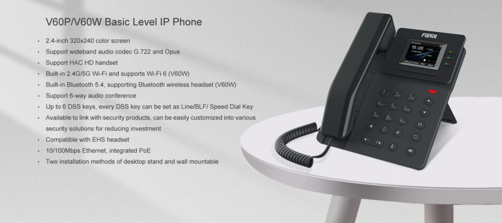Fanvil V60W has 2.4‑inch color screen (320×240) delivers clear call information, contact names, and an intuitive menu interface. Fanvil V60W comes with support for 4 SIP lines and 6‑way local audio conferencing, the V60W enables multi‑party collaboration directly from the handset. HD voice codecs G.722 and Opus, combined with a full‑duplex speakerphone featuring acoustic echo cancellation (AEC) and noise reduction (NR), ensure natural, lifelike conversations.