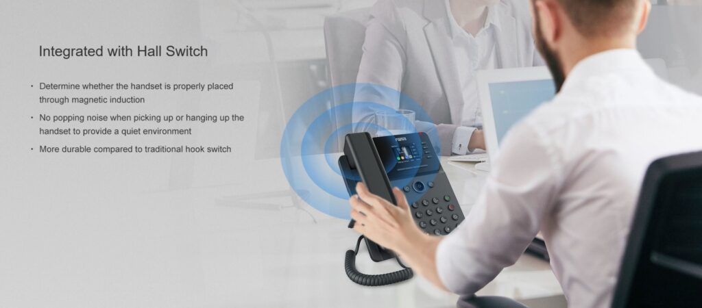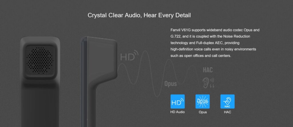 Fanvil V61G is equipped with Fanvil’s HD voice technology, the V61G supports wideband codecs G.722 and Opus, delivering natural, lifelike audio on both the handset and the full‑duplex speakerphone. Advanced acoustic echo cancellation (AEC), noise reduction (NR), and automatic gain control (AGC) ensure productive hands‑free conversations even in moderately noisy environments. The handset includes a hall‑effect sensor for reliable hook detection.