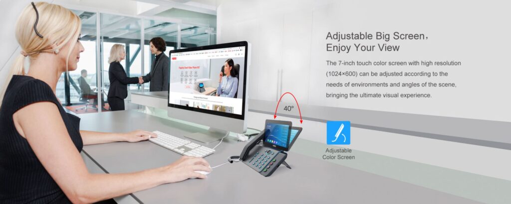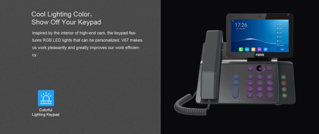The Fanvil V67 is the flagship smart video phone that transforms executive communication into an art form. Designed for C‑suite executives, managers, and teleworkers, the Fanvil V67 combines a large adjustable touch screen, a high‑definition camera, Android OS flexibility, and a stunning lighting keypad – delivering an intelligent, elegant office experience.