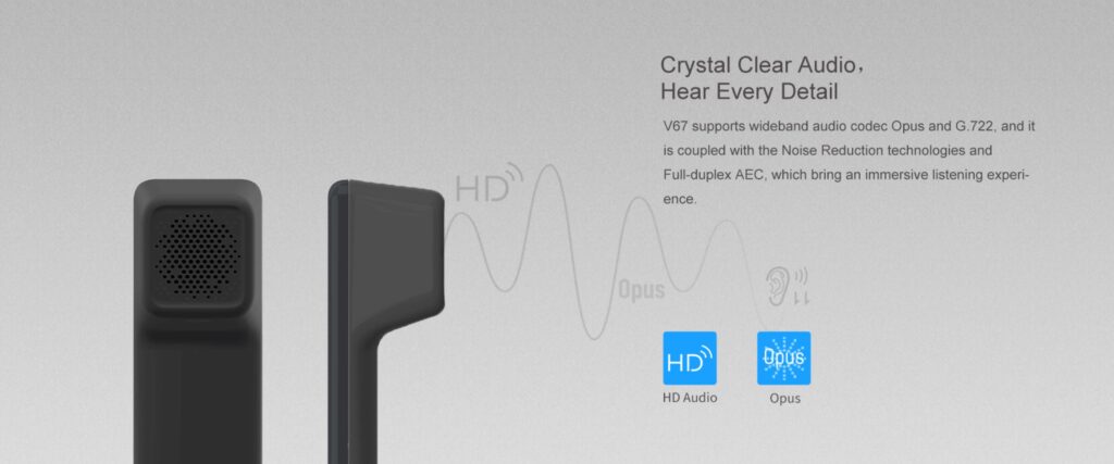 Fanvil’s HD voice technology with wideband codecs G.722 and Opus delivers natural, lifelike audio on both the handset (with hall‑effect sensor) and the full‑duplex speakerphone. Fanvil V67 has advanced acoustic echo cancellation (AEC), noise reduction (NR), automatic gain control (AGC), and packet loss concealment (PLC) ensure crystal‑clear conversations even in challenging acoustic environments. VQM voice quality monitoring provides proactive call quality management.