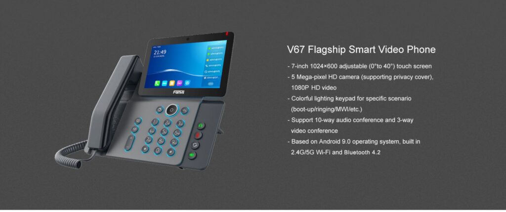 The Fanvil V67 is the ultimate flagship smart video phone – combining a large adjustable touch screen, 5MP HD camera, Android OS, lighting keypad, antibacterial protection, high line capacity, and exceptional audio/video quality for the most demanding executive professionals.
