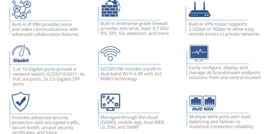 The Grandstream GCC6010 is a powerful, all-in-one Unified Threat Management (UTM) security gateway designed to simplify and secure small to medium business networks. Grandstream GCC6010 it consolidates multiple network functions—including routing, firewall, VPN, wireless controller, and PoE switching—into a single, compact device. Powered by a quad-core 2.0 GHz processor with 2 GB of RAM, it delivers robust performance for demanding network environments.
