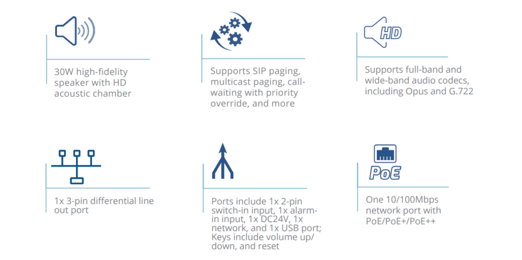 • All-in-One Communication: Functions as SIP phone, multicast/group paging endpoint, Push-to-Talk (PTT) device, and music source.