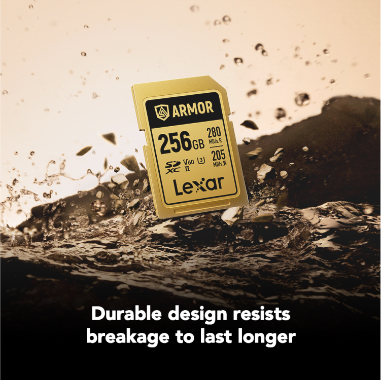 Experience durability and speed like never before with the Lexar 256GB ARMOR GOLD SDXC UHS-II Card. Constructed from stainless steel, this card is 37X stronger than typical SD cards, resistant to drops up to 5 meters, and IP68-rated for dust and water protection. Its simplified, ribless design and laser-engraved surface ensure longevity and resilience in the toughest conditions.