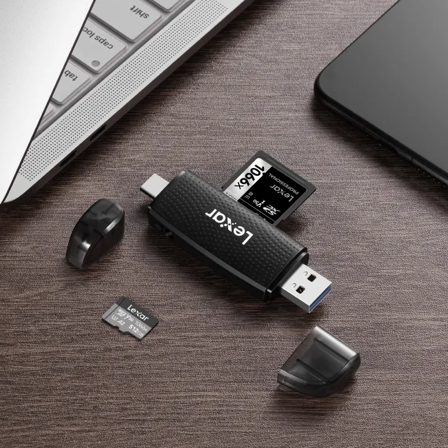 The Lexar 310X Dual-Slot USB-A/C Card Reader delivers fast file access and transfer speeds up to 205MB/s, designed for photographers and videographers who need quick, reliable, and on-the-go performance. With both USB-A and USB-C connectors plus SD™ and microSD™ slots, it offers unmatched flexibility and portability.