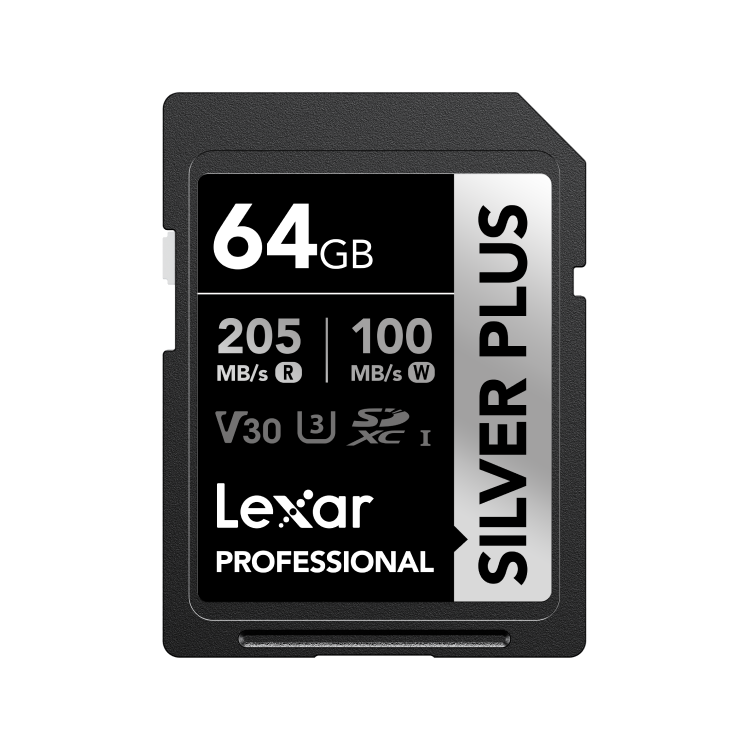 The Lexar Professional SILVER PLUS 64GB SDXC UHS-I card is a high-performance storage solution designed for DSLR cameras, mirrorless cameras, camcorders, and professional creators. With read speeds up to 205 MB/s and write speeds up to 100 MB/s, it enables fast file transfers and smooth capture of high-resolution photos and 4K video.