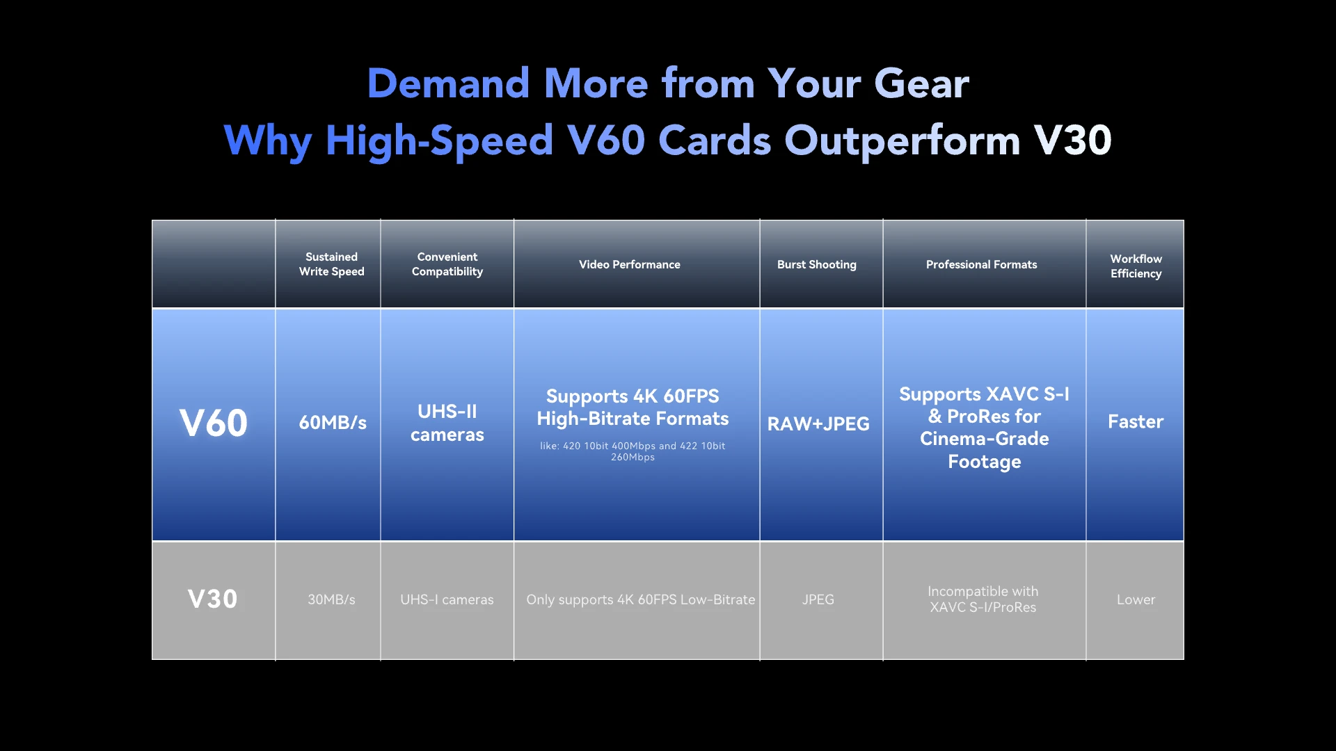 • V60, U3, Class 10 ratings for professional video recording