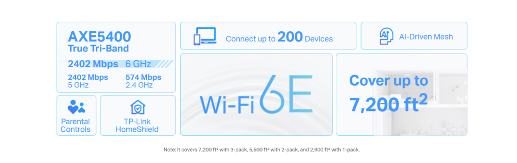 • Tri‑Band Wi‑Fi 6E: AXE5400 total speed (2402 Mbps on 6 GHz + 2402 Mbps on 5 GHz + 574 Mbps on 2.4 GHz)