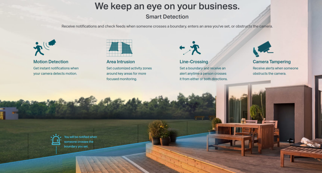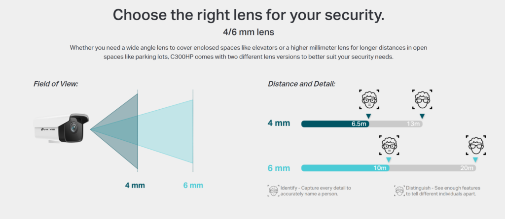 TP‑Link VIGI C300HP 6mm model features a 6mm fixed telephoto lens, providing a narrow 60° diagonal and 51.9° horizontal field of view. This makes it the ideal choice for monitoring perimeters, long driveways, parking lots, building entrances, and other areas where subjects are farther away and a wider lens would dilute detail. The camera’s advanced smart detection suite intelligently identifies line‑crossing and area intrusion events, filtering out false alarms and sending instant push notifications to your mobile device or NVR for immediate response.